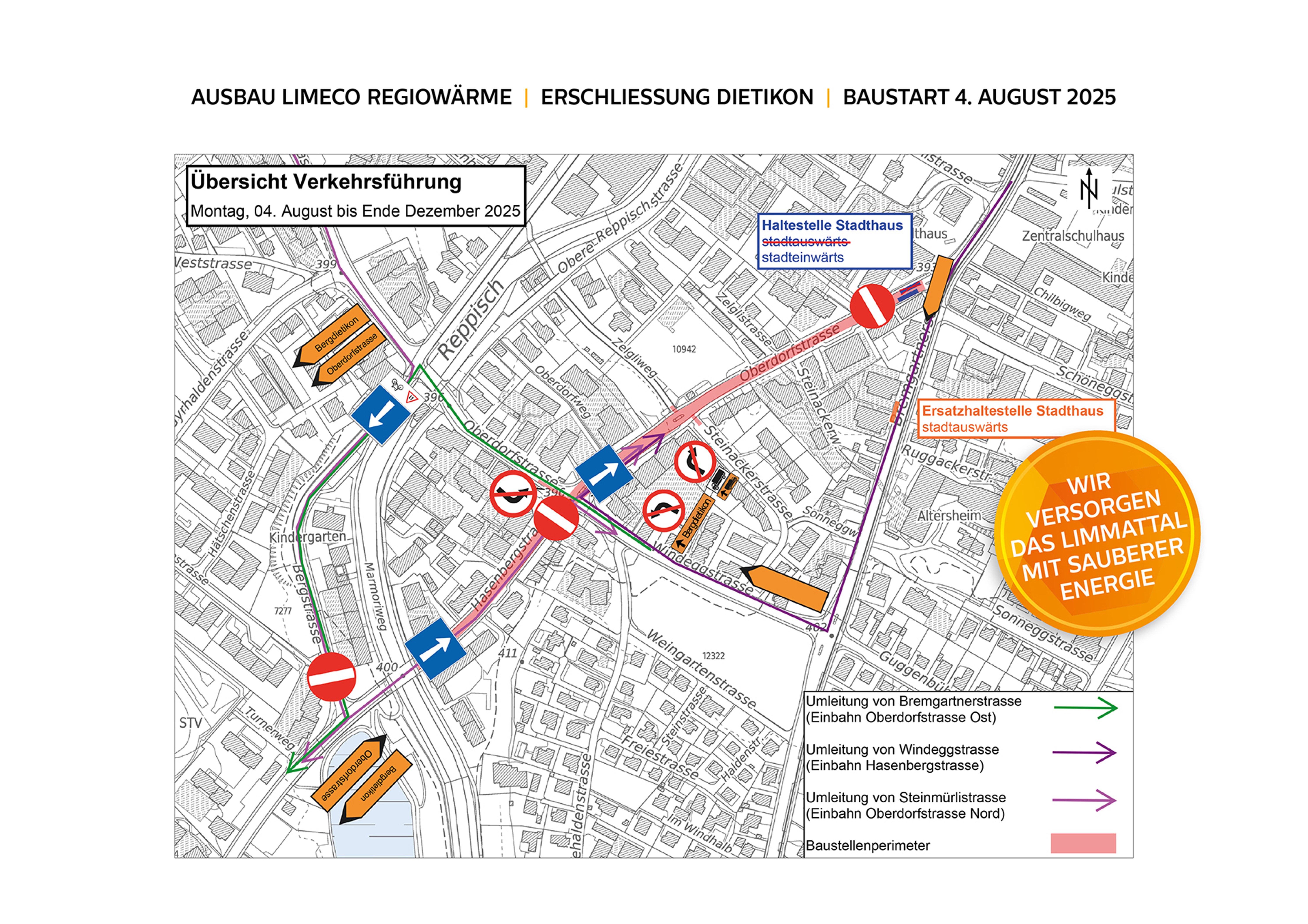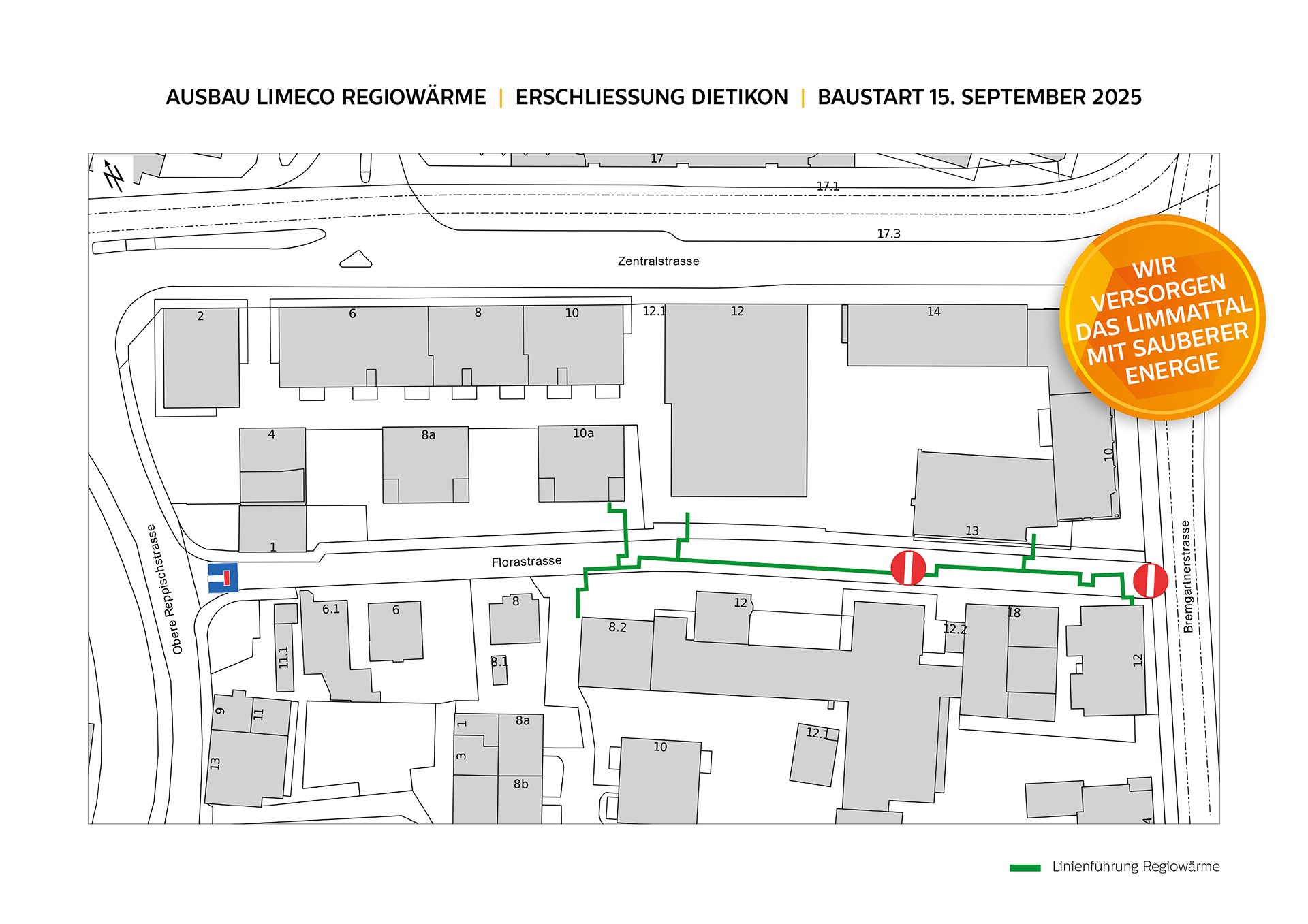 Die Bauarbeiten zum Ausbau von Limeco Regiowärme, der CO₂-neutralen Energie fürs Limmattal, werden in Ihrem Quartier zeitnah ausgeführt. Dafür werden die Leitungen des Regiowärmenetzes in der Strasse verlegt. Zukünftig versorgen sie die angeschlossenen Liegenschaften mit der umweltfreundlichen Wärme aus der regionalen Kehrichtverwertungsanlage.